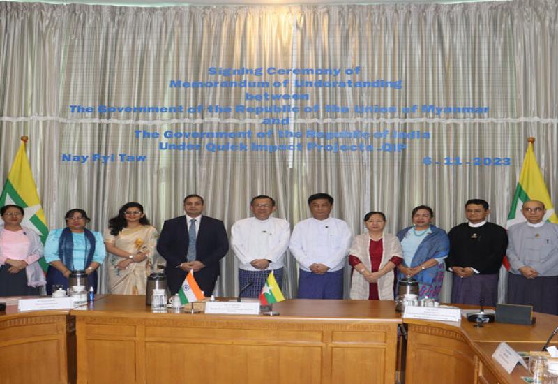 THE signing ceremony for three Memoranda of Understanding between the Government of the Republic of the Union of Myanmar and the Government of the Republic of India under Quick Impact Projects (QIP) was held at the Ministry of Investment and Foreign Economic Relations, Nay Pyi Taw, on 6 November 2023. The ceremony was attended by Dr Kan Zaw, Union Minister for Investment and Foreign Economic Relations, Daw Than Than Lin, Deputy Minister for Planning and Finance, U Lwin Oo, Deputy Minister for Foreign Affairs, Dr Wah Wah Maung, Deputy Minister for Investment and Foreign Economic Relations, Dr Htain Lin Oo, the deputy minister and deputy attorney-general for Legal Affairs, senior officials from relevant ministries, Mr Ashish Sharma, Deputy Chief of Mission, Embassy of India and officials from Embassy of India.