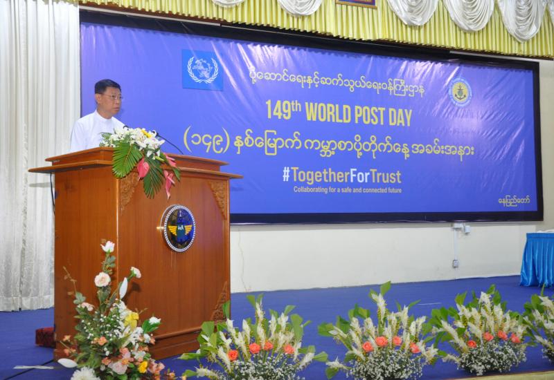 TODAY is the 149th anniversary of the Universal Postal Union (UPU), which comprises 192 member countries and stands as A Truly Universal Network emphasizing the collaboration among the member countries with technical support and rules and regulations for postal services, said State Administration Council Member Deputy Prime Minister Union Minister for Transport and Communications General Mya Tun Oo during the ceremony of the 149th anniversary of World Post Day yesterday in Nay Pyi Taw.