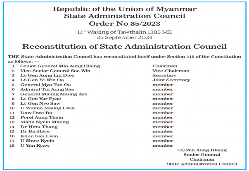 THE State Administration Council issued seven orders under Section 419 of the Constitution of the Republic of the Union of Myanmar yesterday. Order No 85/2023 signed by SAC Chairman Senior General Min Aung Hlaing highlighted the reconstitution of SAC. The remaining orders from 86 to 91 were signed by Secretary Lt-Gen Aung Lin Dwe.