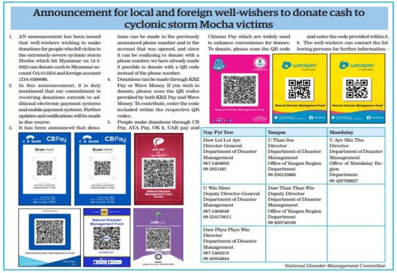 Announcement for local and foreign well-wishers to donate cash to cyclonic storm Mocha victims