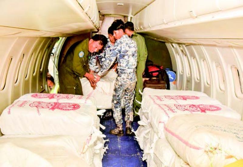 RELIEF aid and food items contributed by families of Tatmadaw (Army, Navy and Air) and well-wishers, and relief supplies provided by the National Disaster Management Committee for local communities affected by Cyclone Mocha in Rakhine State are being transported by Tatmadaw aircraft and helicopters.