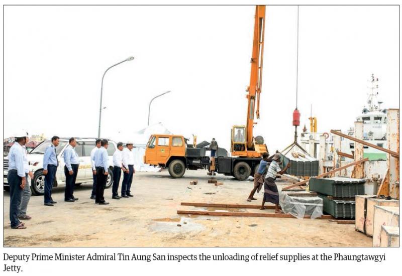 SAC Member Deputy Prime Minister Union Minister for Transport and Communications Admiral Tin Aung San, accompanied by Union Minister for Border Affairs Lt-Gen Tun Tun Naung and Rakhine State Chief Minister U Htein Lin, inspected the new arrival and distribution of relief supplies in Sittway yesterday.