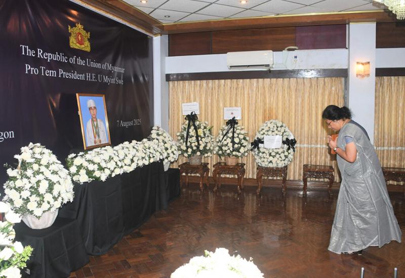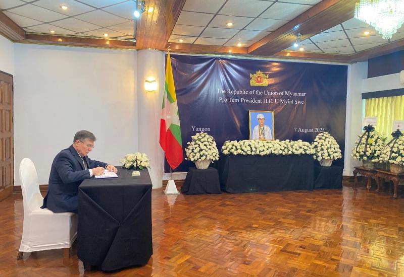 The Ambassadors and Heads of Mission to Myanmar signed the Book of Condolence opened at the Ministry of Foreign Affairs, Sagawah Street, Yangon, to honour the memory of Pro Tem President U Myint Swe, who passed away on 7 August 2025.