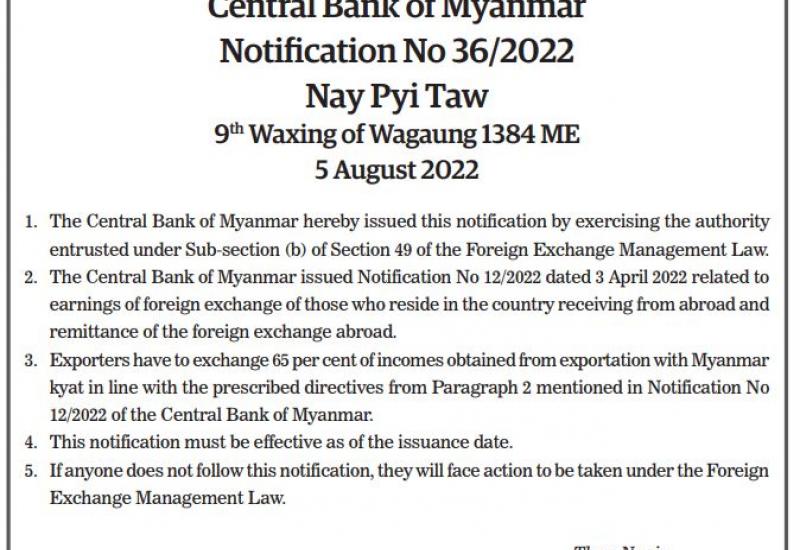 Republic of the Union of Myanmar Central Bank of Myanmar Notification No 36/2022