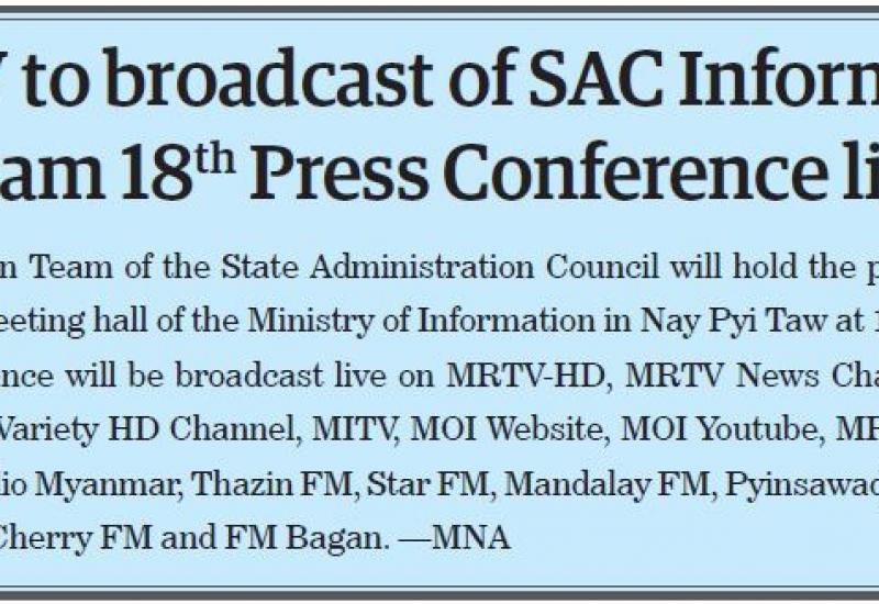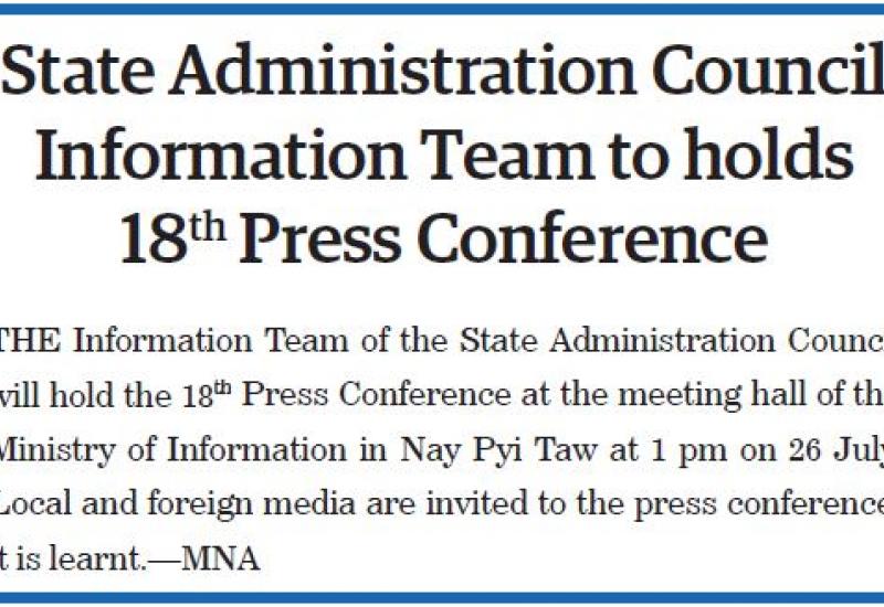 THE Information Team of the State Administration Council will hold the 18th Press Conference at the meeting hall of the Ministry of Information in Nay Pyi Taw at 1 pm on 26 July. Local and foreign media are invited to the press conference, it is learnt. MNA