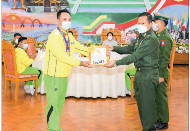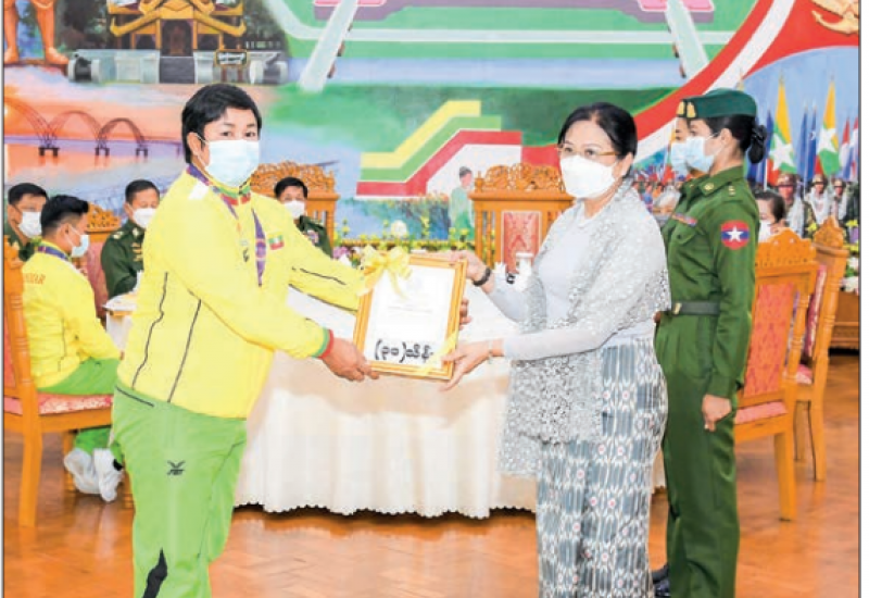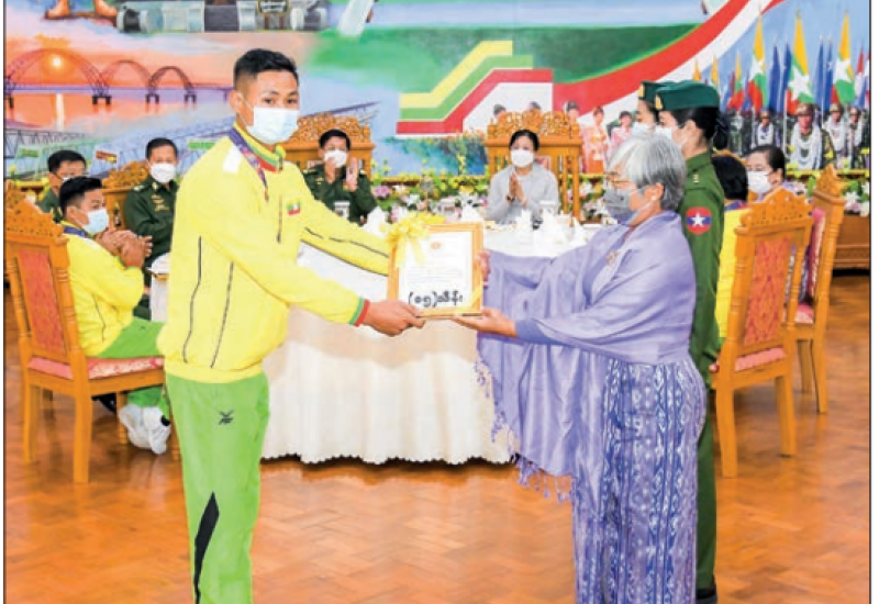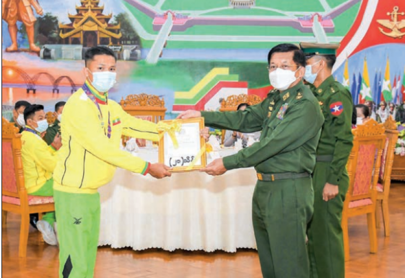 CHAIRMAN of the State Administration Council Commander-in-Chief of Defence Services Senior General Min Aung Hlaing delivered an address at the ceremony to present honorary certificates, certificates of honour and cash awards to victorious athletes and coaches in the XXXI SEA Games held in Viet Nam, at Bayintnaung Villa in Nay Pyi Taw yesterday afternoon.