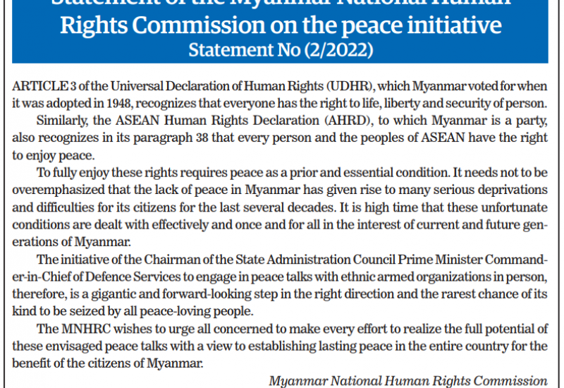 Statement of the Myanmar National Human Rights Commission on the peace initiative Statement No (2/2022)