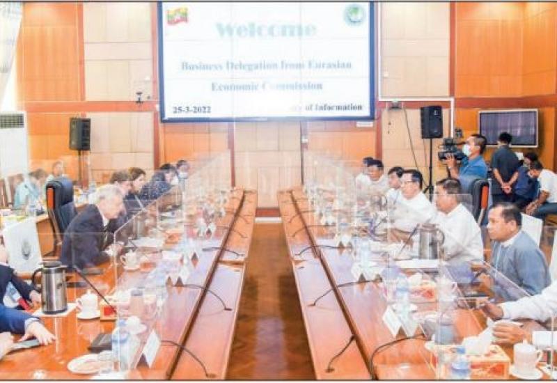 AMONG the delegates who have arrived in Myanmar to discuss potential investment and trade cooperation between Myanmar and the members of the Eurasia Economic Commission at the invitation of the Ministry of Investment and Foreign Economic Relations, the 14-member Eurasian Economic Commission led by Vitaly Maliev, Vice-President of the Russia Association for Friendship and Cooperation with Myanmar was received at the Ministry of Transport and Communications in Nay Pyi Taw yesterday morning.