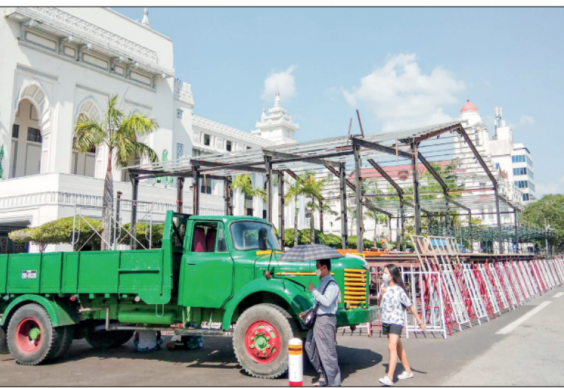 YANGON City’s main pandal isunder construction to celebrate Yangon Maha Thingyan Water Festival of Myanmar Era 1383 in front of the Yangon City Hall. This year, Yangon Maha Thingyan Water Festival will be held successfully, it is learnt.