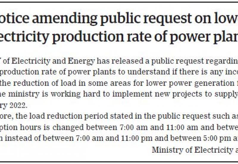 MINISTRY of Electricity and Energy has released a public request regarding the lower electricity production rate of power plants to understand if there is any inconvenience caused by the reduction of load in some areas for lower power generation for balance load and the ministry is working hard to implement new projects to supply the power on 5 January 2022.