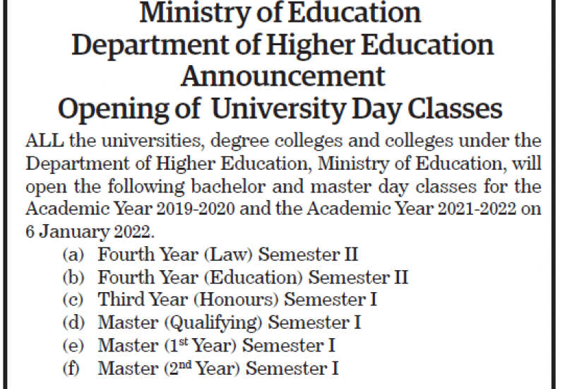 Republic of the Union of Myanmar Ministry of Education Department of Higher Education Announcement Opening of University Day Classes