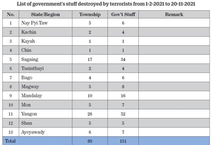 CRPH and NUG terrorists targeting to committing the utter devastation formed PDF terrorist group, murdering the people peacefully residing in some areas with various reasons, setting fire to and robbing State owned buildings, public hospitals, schools, housings, villages, markets, State owned banks and private banks.