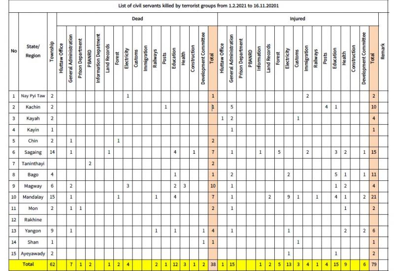 A press release was issued on 17 November regarding the arrest of a total of 47 suspects – 40 men and 7 women, who murdered the security forces at the Thanlyin Bridge, North Okkalapa Bridge, Htantabin Township, and Bargaya Traffic Light, under the attacks of terrorist NUG and NLD member Phyo Zeyar Thaw. They were arrested with 34 assorted small arms, 70 assorted magazines, 2,105 assorted rounds of ammunition, 17 40mm grenades, 10 homemade bombs, two grenades eight mines, five smoke bombs, seven bags of gunpowder, and one binoculars.