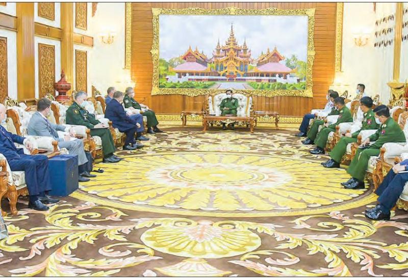 CHAIRMAN of the State Administration Council Commander-in-Chief of Defence Services Senior General Min Aung Hlaing received a delegation led by Chairman of the Russian-Myanmar Military Technological Cooperation Joint Commission Deputy Director of FSMTC of Russia Mr Vladimir Drozhzhov and Deputy Director-General of JSC “Rosoboronexport” Company Mr AL Chekmarev at the hall of Bayintnaung Villa in Nay Pyi Taw yesterday afternoon.