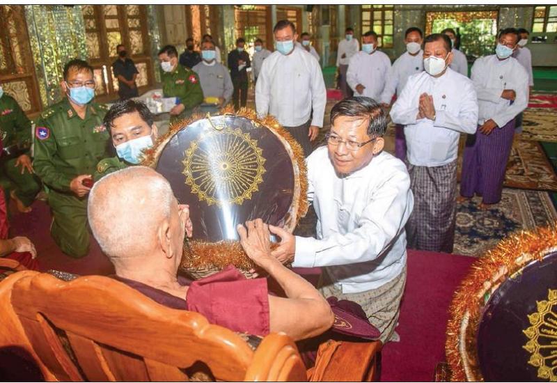 CHAIRMAN of the State Administration Council Prime Minister Senior General Min Aung Hlaing paid homage to Chairman of the State Sangha Maha Nayaka Committee Presiding Nayaka of Bhamo Monastery Abhidhaja Maha Rattha Abhidhaja Agga Maha Saddhammajotika Dr Bhaddanta Kumara Bhivamsa Bhamo Sayadaw at Bhamo Monastery in Mahaaungmye Township of Mandalay Region yesterday.