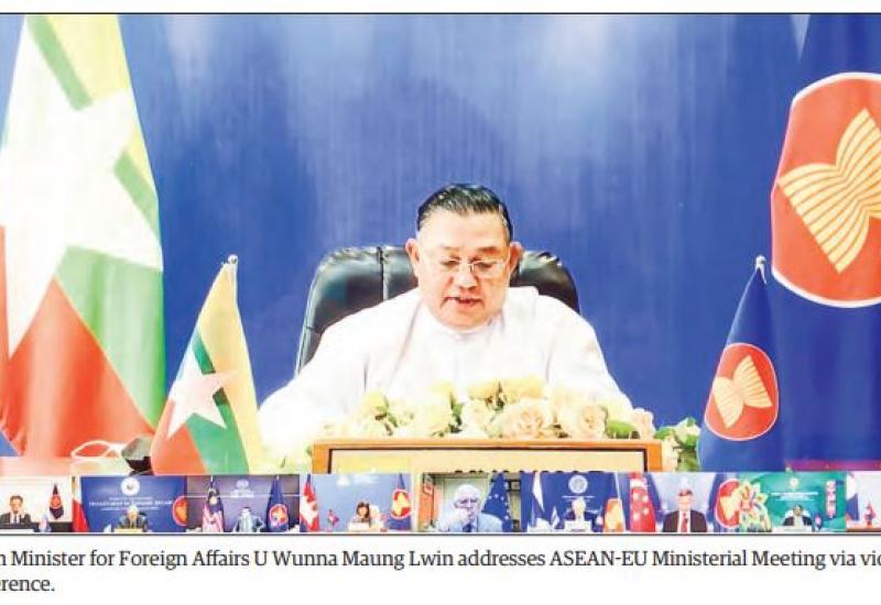 U WUNNA MAUNG LWIN, Union Minister for Foreign Affairs, participated in the ASEAN-European Union Ministerial Meeting held via video conference at 3 pm on 6 August 2021 from the Ministry of Foreign Affairs, Nay Pyi Taw.