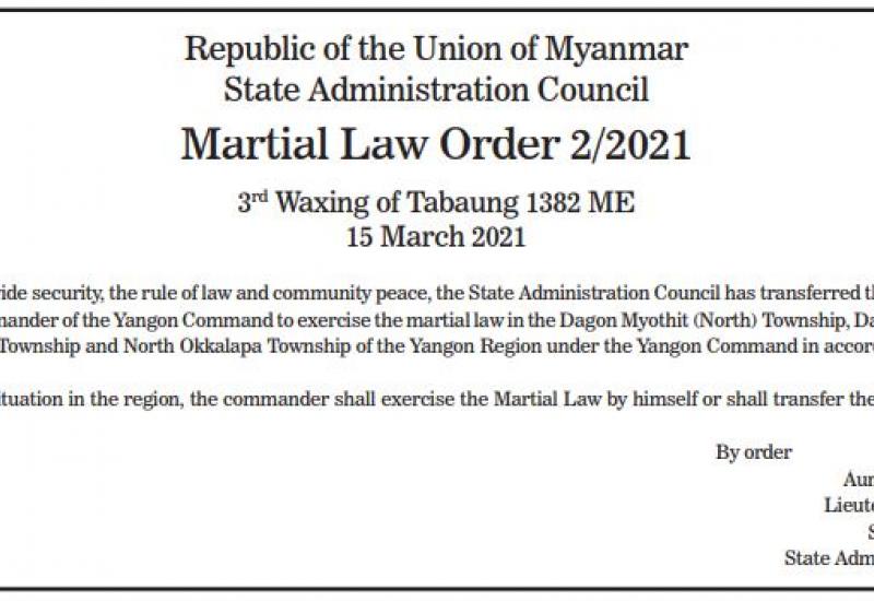 1. With the State Administration Council’s Martial Law Order 1/2021 dated 14 March 2021 (2nd Waxing of Tabaung, 1382 ME) and the Martial Law Order 2/2021 dated 15 March 2021 (3rd Waxing of Tabaung, 1382 ME), the council has transferred the executive and judiciary power to the Commander of Yangon Command to exercise the Martial Law in accordance with Article 419 of the State Constitution to enforce security, the rule of law and community peace in Yangon Region’s townships Hlinethaya, Shwepyitha, Dagon Myothit (South), Dagon Myothit (North), Dagon Myothit (Seikkan) and North Okkalapa.