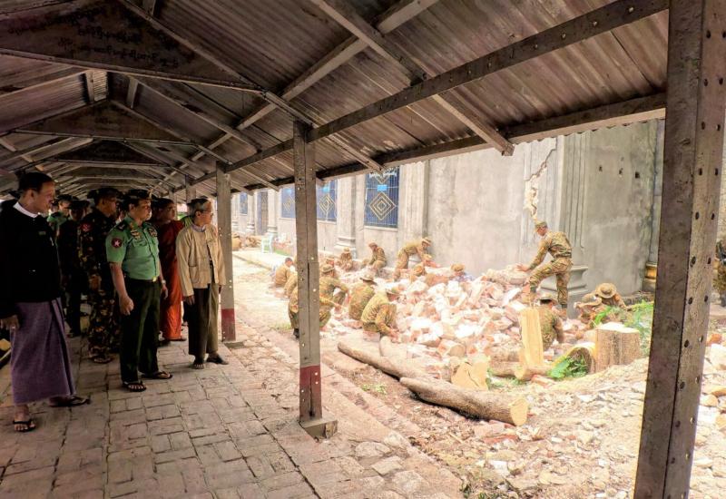 Chairman of the State Administration Council Prime Minister Senior General Min Aung Hlaing, accompanied by his wife Daw Kyu Kyu Hla, Council Joint Secretary General Ye Win Oo and chief ministers of Mandalay and Sagaing regions, yesterday inspected ongoing rehabilitation operations for loss and damage caused by the earthquake in Sagaing and Mandalay.