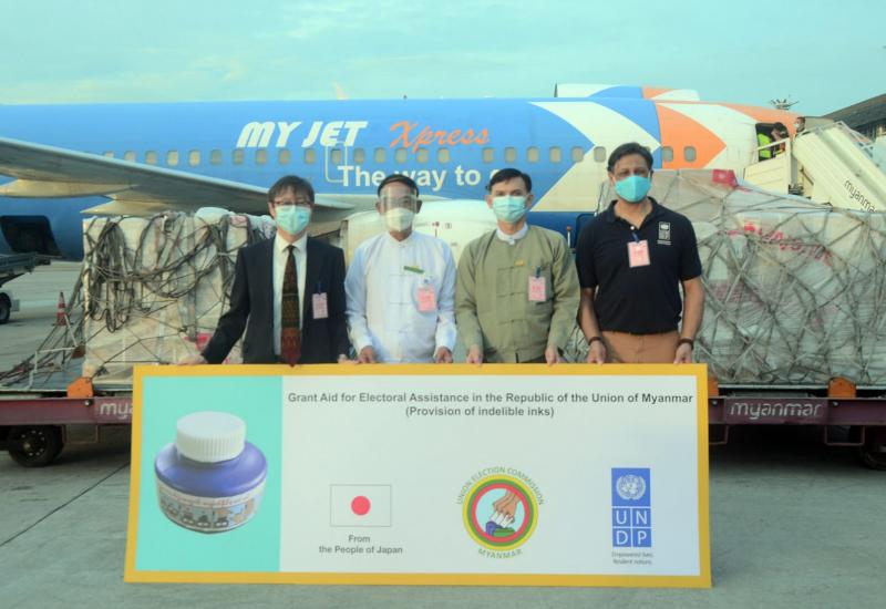 A total of 113,000 bottles of indelible ink supported by the Japanese government and its people arrived in Yangon by a special flight from Kuala Lumpur of Malaysia yesterday afternoon.