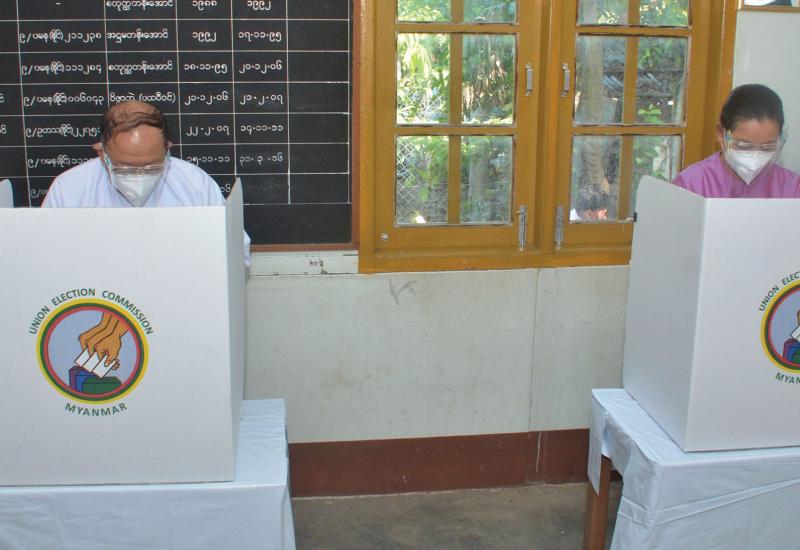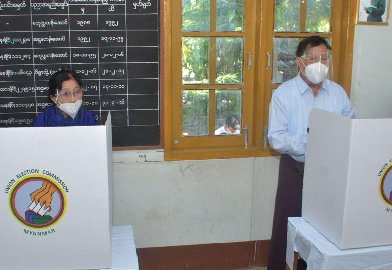 CHIEF Justice of the Union U Tun Tun Oo and wife Daw Aye Aye Thein cast their advance votes together with Chairman of the Constitutional Tribunal of the Union U Myo Nyunt and wife Daw Htay Yi, and Chairman of the Union Election Commission U Hla Thein and wife Daw Aye Thidar in Nay Pyi Taw yesterday morning.