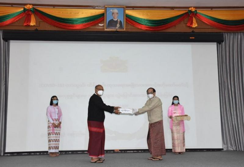 Amyotha Hluttaw Speaker Mahn Win Khaing Than and government officials presented cash donations to the National-Level Committee on Prevention, Control and Treatment of COVID-19 through Union Minister for Health and Sports Dr Myint Htwe yesterday.