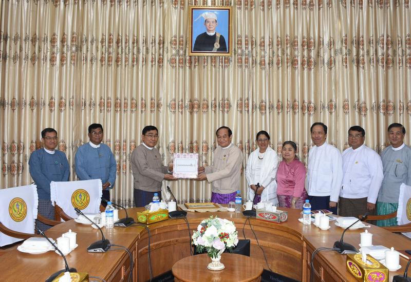 Union Minister for Social Welfare, Relief and Resettlement Dr Win Myat Aye, the vice-chairman of disaster management committee, presented the cash donation to Union Minister for Health and Sports Dr Myint Htwe, the secretary (2) of central committee.