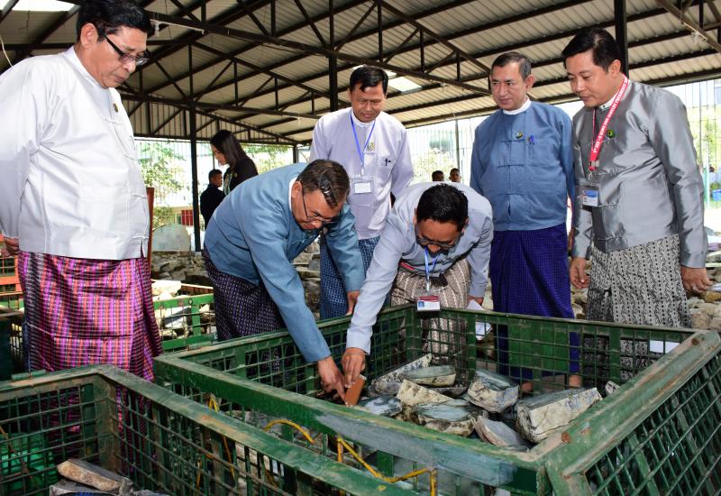 Union Minister for Natural Resources and Environmental Conservation U Ohn Win, Deputy Minister Dr Ye Myint Swe and officials visited the emporium yesterday morning, and looked around the display of gems and jade lots.