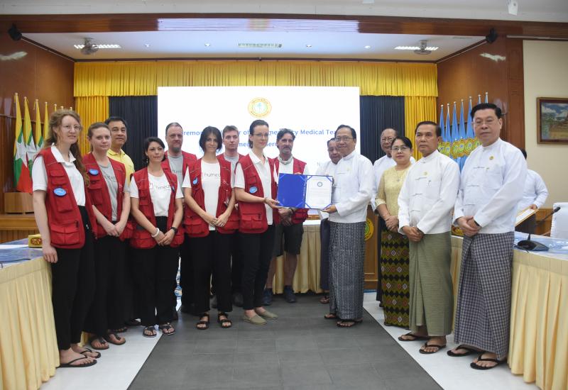 Union Minister for Health Dr Thet Khaing Win, on behalf of the National Disaster Management Committee Chairman, organized a farewell event for the German emergency medical team that completed their duties yesterday.