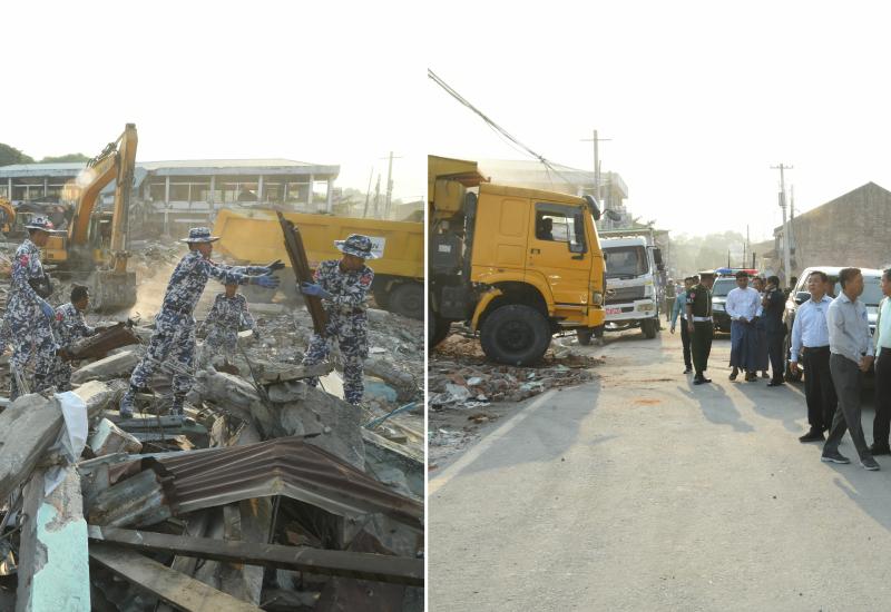 Vice-Chairman of the State Administration Council Deputy Prime Minister, Vice-Senior General Soe Win, who is also Chairman of the National Disaster Management Committee, inspected the damage to the No 1 Myoma Market in Pyinmana and the Institute of Agriculture and Livestock Breeding caused by the earthquake in Nay Pyi Taw Council Area yesterday afternoon.