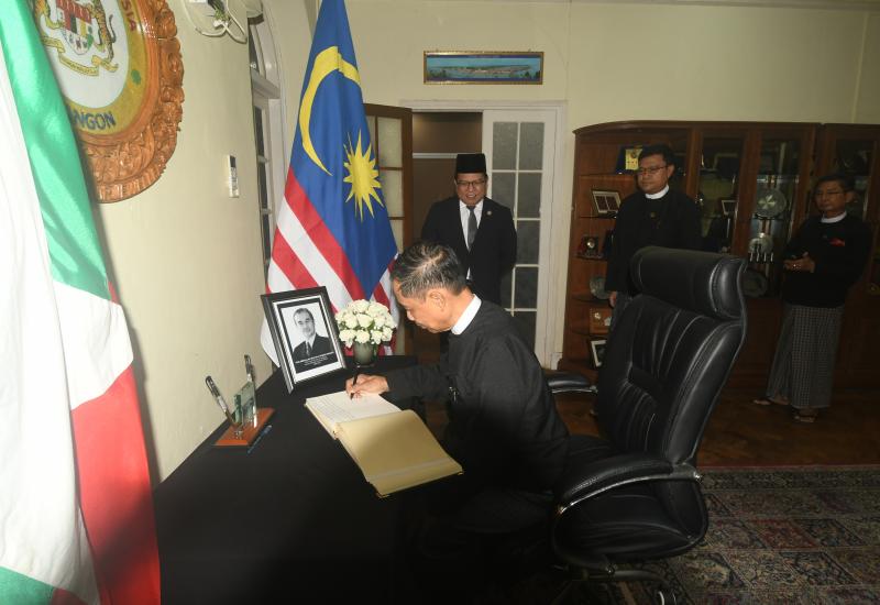 ON behalf of the Government of the Republic of the Union of Myanmar, Union Minister U Ko Ko Hlaing of the Ministry 2 at the Chairman Office of the State Administration Council signed the condolence book for the late former Malaysian Prime Minister Tun Abdullah Ahmad Badawi at the Malaysian Embassy in Yangon yesterday.