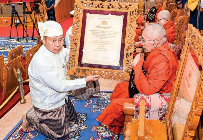 Aceremony to offer religious titles for 2025 was held in conjunction with the rice-offering ceremony in the precinct of Maravijaya Buddha Park in Nay Pyi Taw yesterday afternoon, attended by Chairman of the State Administration Council Prime Minister Senior General Min Aung Hlaing and his wife Daw Kyu Kyu Hla.