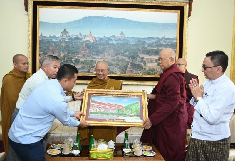 The members of the Sangha led by His Holiness Samdech Preah Abhisiri Sugandha Mohasangharajah Dhipati Dr Bour Kry from Dhammayuttika Nikaya who is one of the Adhipati Sayadaws in Cambodia, currently in Myanmar, visited the International Theravada Buddhist Missionary University, in Yangon yesterday.