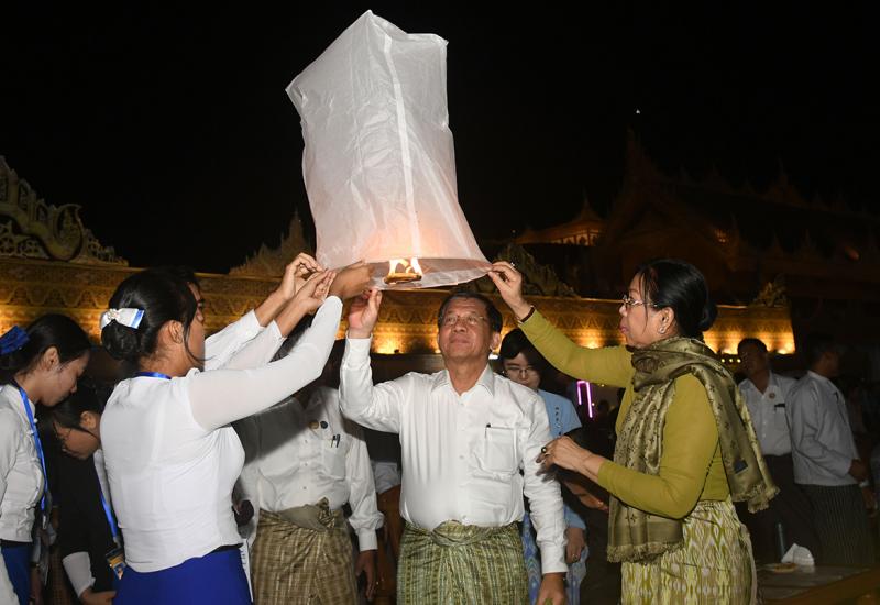 Aceremony to launch hot-air balloons to mark the Tazaungdine lighting festival was held on a grand scale at the water fountain in the Maravijaya Buddha Park in the precinct of Maravijaya Buddha Image in Dekkhinathiri Township of Nay Pyi Taw Union Territory yesterday evening.