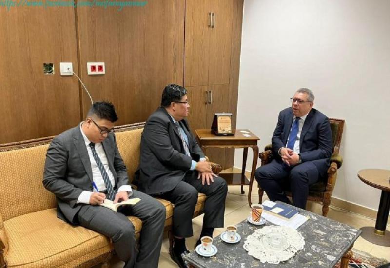 The Ambassador of the Republic of the Union of Myanmar U Kyaw Tin Shein, paid a courtesy call on Ambassador Ahmed Shaheen, Assistant Foreign Minister for Asian Affairs of the Ministry of Foreign Affairs of the Arab Republic of Egypt, at the New Administrative Capital on 3 November to exchange views on further bilateral cooperation and matters of mutual interests between the two countries.