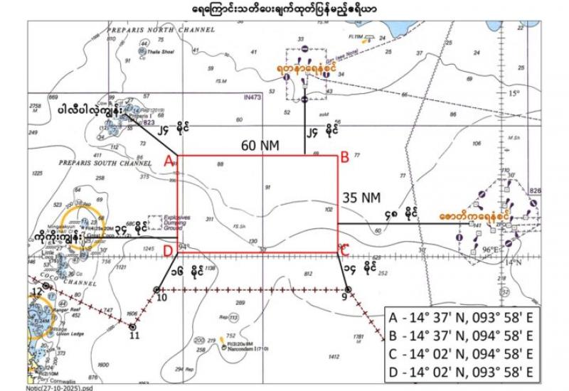 1.The naval maritime exercises will be conducted within Myanmar’s territorial waters from 7 to 8 November 2025, involving surface and aerial fire drills. The designated area for naval exercise is defined by the coordinates – Point A: Latitude 14°37’N and Longitude 93°58’E, Point B: Latitude 14°37’N and Longitude 94°58’E, Point C: Latitude 14°02’N and Longitude 94°58’E and Point D: Latitude 14°02’N and Longitude 93°58’E, and maritime and aerial warnings have been announced.