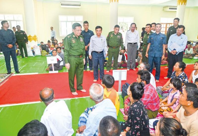 Senior General Min Aung Hlaing pledged, “We will provide cash assistance for the totally damaged buildings, damaged huts, partially damaged houses and huts, one-storey houses and two-storey houses as much as possible.”