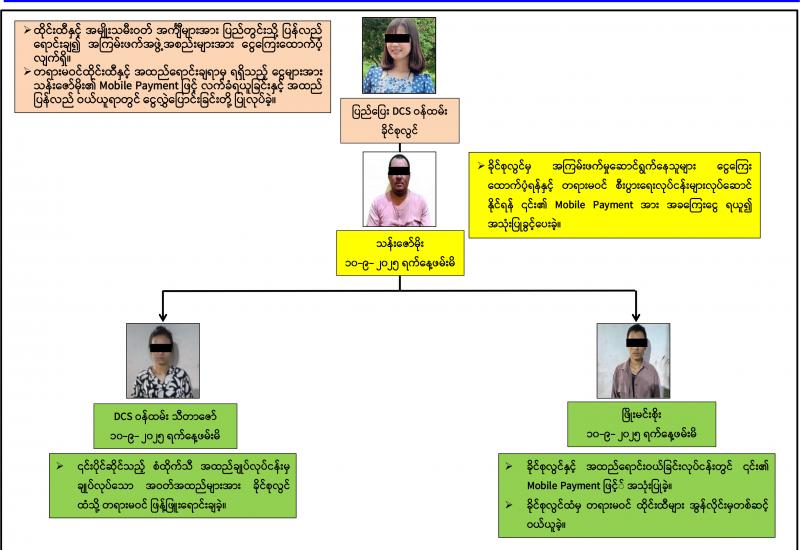 The security forces arrested Thida Zaw, DCS of the Ministry of Education, and Phyo Min Soe, who are running the San Htike Thi garment business in Chanmyathazi Township, Mandalay Region, and Than Zaw Moe from Mingaladon Township in Yangon on 10 September for involvement in financial fraud, illegal lottery and businesses.