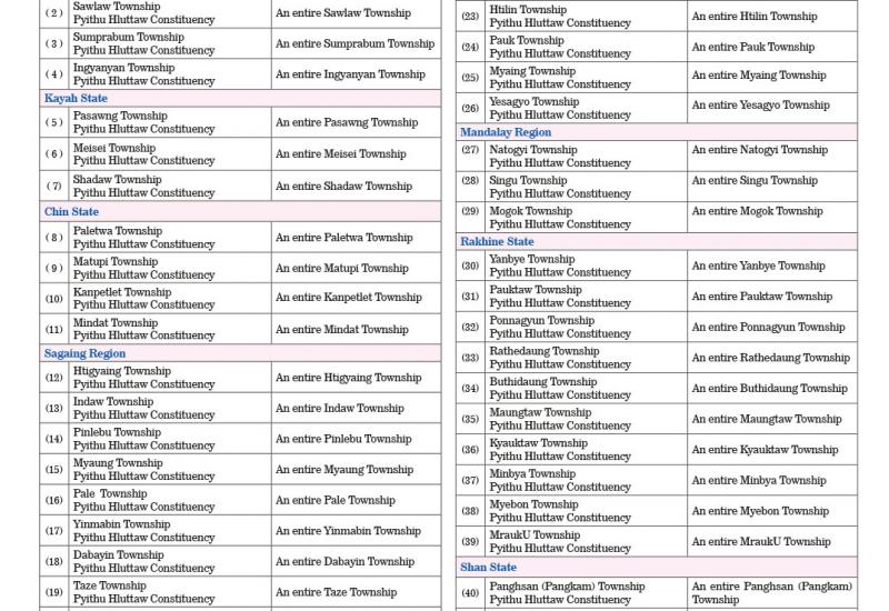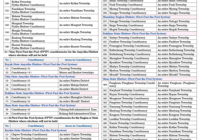 Announcement of the list of Pyithu Hluttaw constituencies, Amyotha Hluttaw First-Past-the-Post (FPTP) constituencies, and Region or State Hluttaw First-Past-the-Post (FPTP) constituencies where elections will not be held