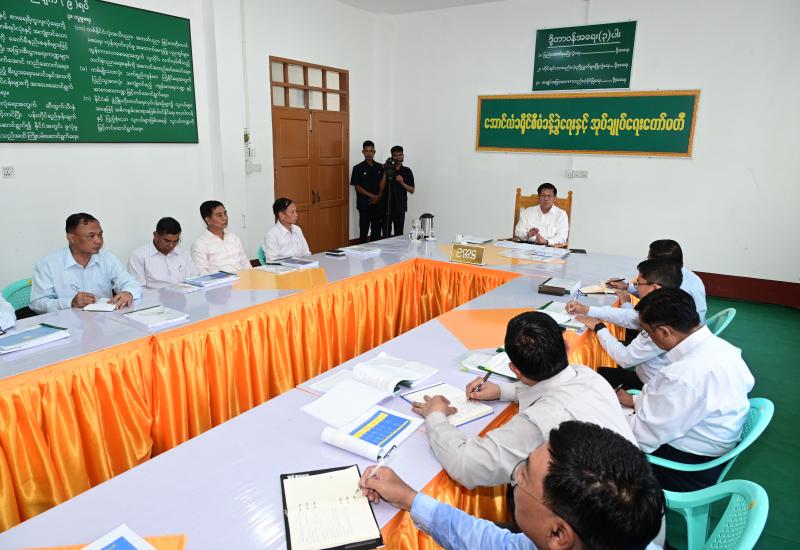 Chairman of the State Security and Peace Commission of the Republic of the Union of Myanmar Senior General Min Aung Hlaing, accompanied by Commission Secretary, and Joint Executive Chief General Ye Win Oo, Union ministers, senior Tatmadaw officers from the Office of the Commander-in-Chief, the Magway Region Chief Minister, the commander of Central Command and officials, met departmental officials at the hall of Aunglan District General Administrator’s office in Aunglan to discuss regional development activities.