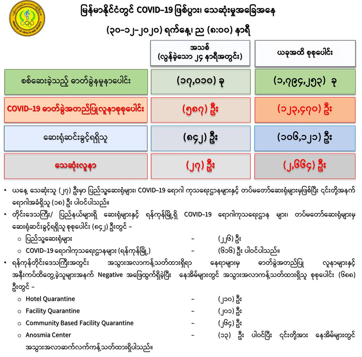 (၂၉-၁၂-၂၀၂၀) ရက်နေ့၊ ည (၈:၀၀) နာရီမှ (၃၀-၁၂-၂၀၂၀) ရက်နေ့၊ ည (၈:၀၀) နာရီ အတွင်း ဓာတ်ခွဲနမူနာ စုစုပေါင်း (၁၇,၀၁၀) ခုအား စစ်ဆေးပြီးစီးခဲ့ရာ COVID-19 ရောဂါ ဓာတ်ခွဲအတည်ပြု လူနာသစ် (၅၈၇) ဦး တွေ့ရှိရပါသည်။