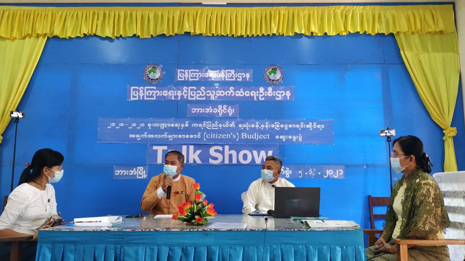Talk Show ဆွေးနွေးပွဲတွင် ကရင်ပြည်နယ်အစိုးရအဖွဲ့၊ စီမံကိန်း၊ဘဏ္ဍာရေးနှင့်စည်ပင်သာယာရေးဝန်ကြီး ဦးသန်းနိုင်၊ ပြည်နယ်ရသုံးမှန်းခြေငွေစာရင်းဦးစီးဌာန ညွှန်ကြားရေးမှူးဦးသန်းရီ၊ ပြည်နယ်စီမံကိန်းရေးဆွဲရေးဦးစီးဌာန ပြည်နယ်ဦးစီးမှူး ဒေါ်ခင်သန်းနု တို့က ဘဏ္ဍာရေးဆိုင်ရာပွင့်လင်းမြင်သာမှုရှိရေး၊ တာဝန်ယူမှု တာဝန်ခံမှုရှိရေး၊ ပြည်သူလူထုပူးပေါင်း ပါဝင်နိုင်မည့်နည်းလမ်းများ ဖော်ထုတ်ပေးရေး၊ Citizen Budget စာစောင်ကို ဖတ်ရှု့ခြင်းအားဖြင့် သိရှိနိုင်မည့်အချက်များ၊ ကရင်ပြည်နယ်အစိုးရအဖွဲ့၏လုပ်ငန်းတာဝန်များ၊ အစိုးရ၏ဦးစားပေးမူဝါဒများ၊ မေခရိုစီးပွားရေး ဆိုင်ရာအချက်အလက်များ၊ ဘတ်ဂျက်တွင်ပါဝင်သောဌာနအဖွဲ့အစည်းများ၊ နိုင်ငံတော်၏ဘဏ္ဍာရေးမူဝါဒ၊ ဘတ်ဂျက် လုပ်ငန်းစဉ်နှင့်ရေးဆွဲမှုတွင် ပါဝင်နိုင်သောအခွင့်အလမ်းများ၊ ဌာနအဖွဲ့အစည်းများ၏အရအသုံးအခြေအနေ၊ ဘဏ္ဍာရေး ဆိုင်ရာထောက်ပံ့မှု၊ ရငွေလျာထားမှု၊ အခွန်အကောက်လျာထားမှု၊ ပြည်သူရရှိနိုင်မည့်အကျိုးကျေးဇူးများ၊ ရန်ပုံငွေနှင့် ကြွေးမြီရငွေအခြေအနေတို့ကို ဆွေးနွေးခဲ့ကြသည်။