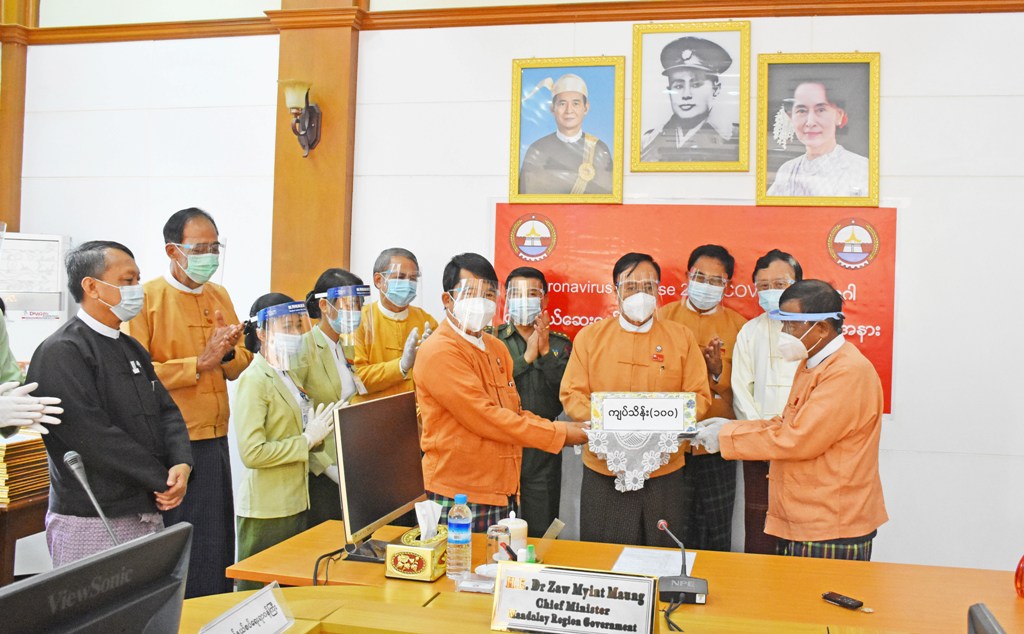 ကိုဗစ် - ၁၉ကာကွယ်ဆေး ဝယ်ယူရရှိရေးအတွက် လှူဒါန်းကြသည့် ငွေကျပ်သိန်းပေါင်း ရှစ်ထောင့်ကိုးရာ ငါးသိန်းကျော်ကို မန္တလေးတိုင်းဒေသကြီး အခွန်ဦးစီးဌာနသို့ လွှဲပြောင်းလှူဒါန်း