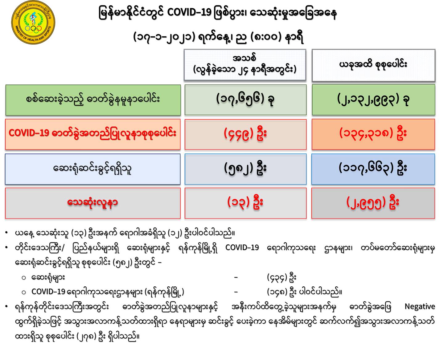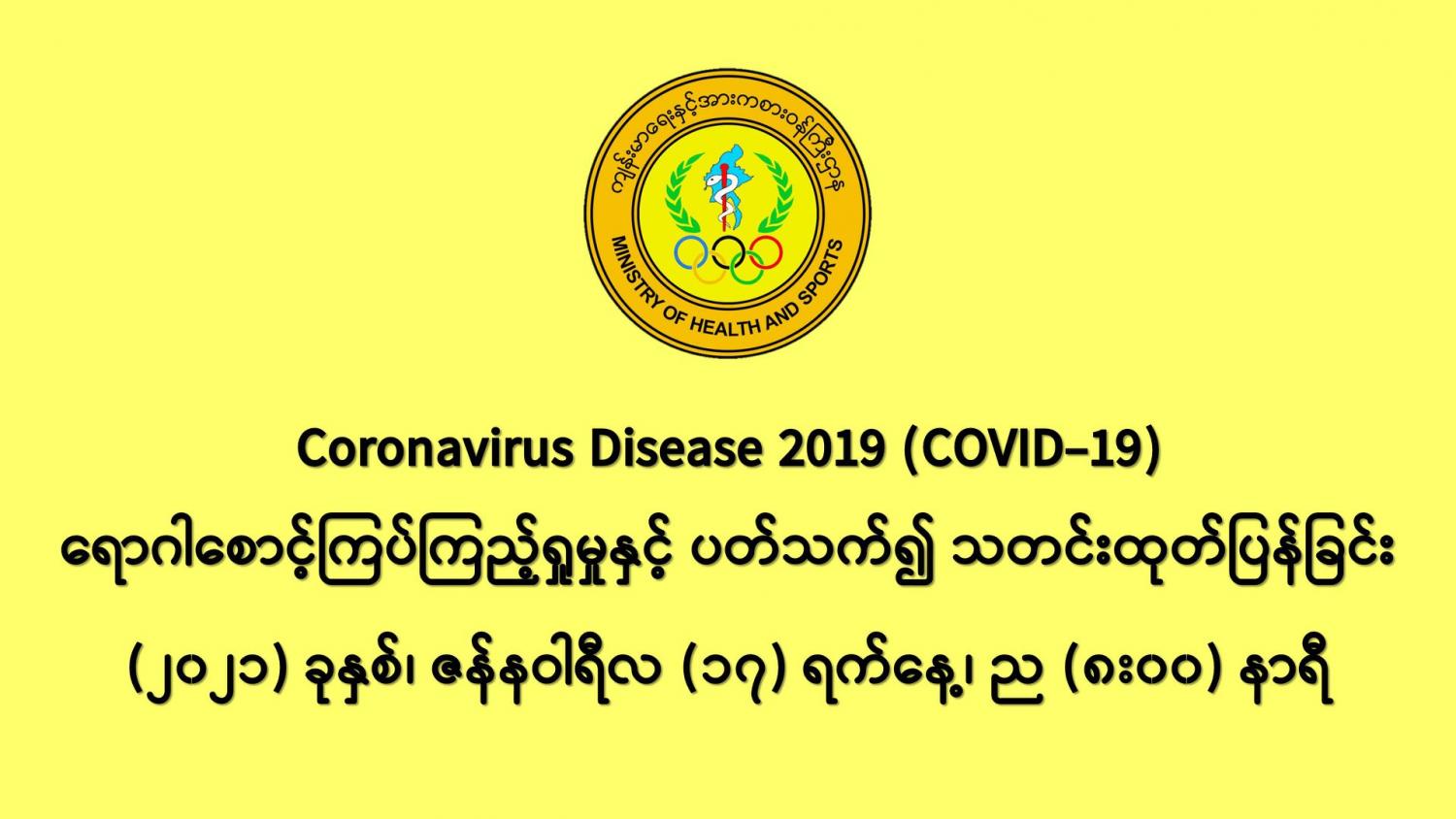 COVID-19 ရောဂါစောင့်ကြပ်ကြည့်ရှုမှုနှင့်ပတ်သက်၍ သတင်းထုတ်ပြန်ခြင်း (၁၇-၁-၂၀၂၁) ရက်နေ့၊ ည (၈:၀၀)နာရီ 01/17/2021 (၁၆-၁-၂၀၂၁) ရက်နေ့၊ ည (၈:၀၀) နာရီမှ (၁၇-၁-၂၀၂၁) ရက်နေ့၊ ည (၈:၀၀) နာရီ အတွင်း ဓာတ်ခွဲနမူနာ စုစုပေါင်း (၁၇,၆၅၆) ခုအား စစ်ဆေးပြီးစီးခဲ့ရာ COVID-19 ရောဂါ ဓာတ်ခွဲ အတည်ပြု လူနာသစ် (၄၄၉) ဦး တွေ့ရှိရပါသည်။ #Ministry_of_Health_and_Sports, #MoHS, #COVID19LabResults, #ကိုရိုနာဗိုင်းရပ်စ်, #ဓာတ်ခွဲအဖြေ