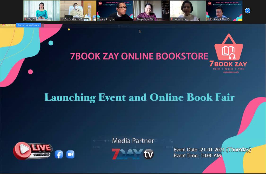 ထို့နောက် မြန်မာနိုင်ငံ စာပေထုတ်ဝေသူနှင့် ဖြန့်ချိသူများအသင်း၏ဥက္ကဋ္ဌ ဒေါ်နန်းကလျာဝင်းက အဖွင့်အမှာစကား ပြောကြားပြီး Information Matrix Co.,Ltd ၏ CEO ဦးသောင်းစုငြိမ်းက ကြိုဆိုနုတ်ခွန်းဆက်စကား ပြောကြားကာ 7 Book Zay Online Bookstore အား Virtual စနစ်ဖြင့် ဖွင့်လှစ်ပေးခဲ့ကြသည်။