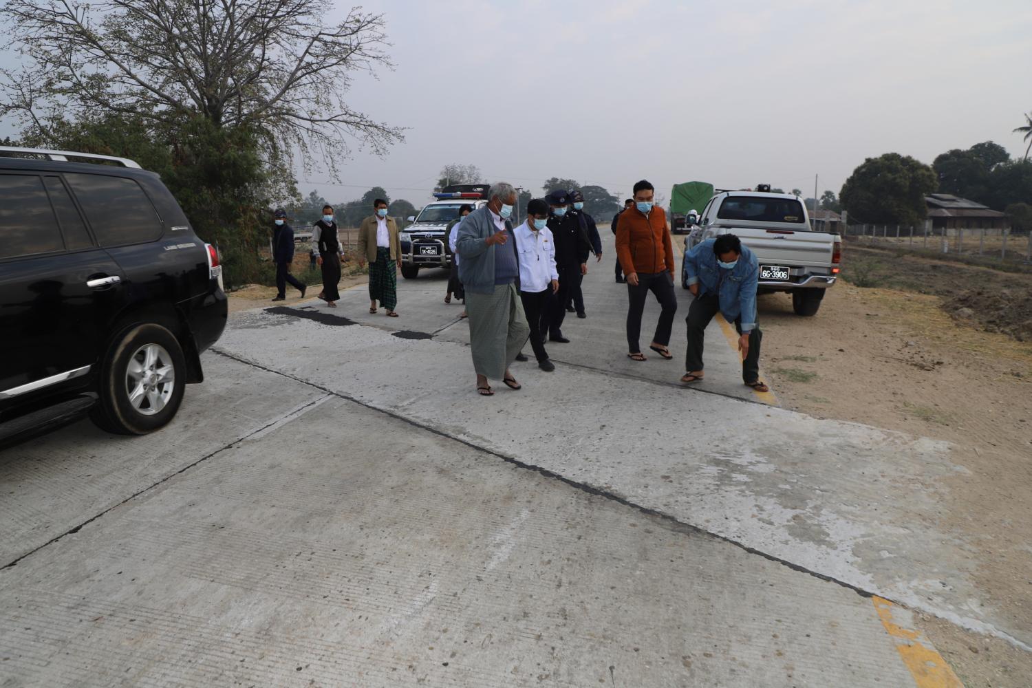 စစ်ကိုင်းတိုင်းဒေသကြီး ဝန်ကြီးချုပ် ဒေါက်တာမြင့်နိုင်သည် ရွှေဘိုခရိုင်/မြို့နယ် စီမံခန့်ခွဲမှုကော်မတီ ဥက္ကဋ္ဌများ နှင့် တာဝန်ရှိသူများ လိုက်ပါ၍ ယနေ့ နံနက် (၈)နာရီက ရွှေဘိုမြို့ မြို့ရှောင်လမ်းပေါ်ရှိ လမ်းတံတားများ ကြံ့ခိုင်မှုအေခြအနေနှင့် ယာဉ်ကြီးယာဉ်ငယ်များဖြင့် ကုန်စည်ပို့ဆောင်ဖြတ်သန်းသွားလာမှု အခြေအနေတို့အား ကြည့်ရှုစစ်ဆေးပြီး သံကူကွန်ကရစ်တံတားအမှတ် ၂/၃ တံတားအကျယ် ၅×၅၀ ပေ နေရာတွင် တံတားကြမ်းခင်း ပေါက်ပြဲနေမှုတို့အား အမြန်ဆုံးပြုပြင်ဆောင်ရွက်သွားကြရန်နှင့် လိုအပ်သည်များကို အားလုံးပူးပေါင်း ဆောင်ရွက်သွားကြရန် မှာကြားခဲ့သည်။