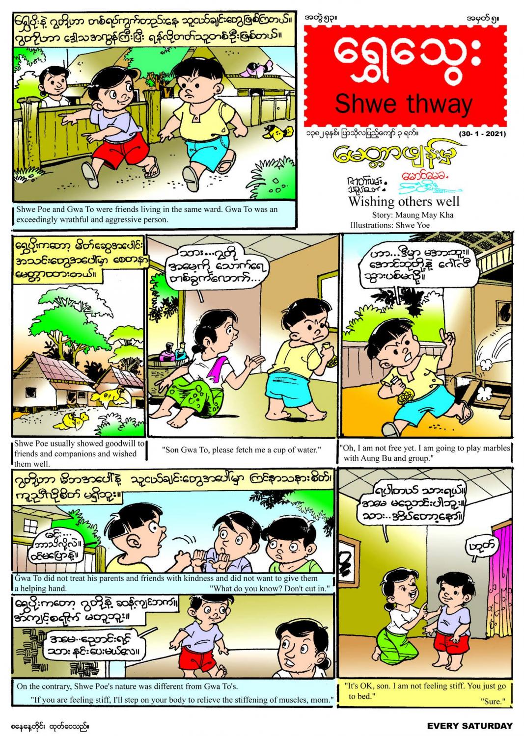 ဇန်နဝါရီ ၃၀ ရက် (စနေနေ့) တွင် ထုတ်ဝေမည့် ရွှေသွေးဂျာနယ်တွင် မည်သည့်လုပ်ငန်းမဆို ရန်လို လားသည့်စိတ်ကို ပယ်ဖျက်၍ အကောင်း မြင်စိတ်နှင့် မေတ္တာ၊ စေတနာထားပြီး လုပ်ဆောင်မှသာ အောင်မြင် ကြီးပွားမည်ဖြစ်ကြောင်း သရုပ်ဖော် တင်ဆက်ထားသည့် “မေတ္တာဖျန်းမှ” မျက်နှာဖုံး ကာတွန်း၊ ပြာသိုလတွင် ကျင်းပသော မြင်းခင်းသဘင်ပွဲ အကြောင်းကို ကလေးတို့ ဗဟုသုတ တိုးပွားစေရန် တင်ဆက်ထားသည့် “ပြာသိုလနှင့် မြင်းခင်းသဘင်” သုတ ဆောင်းပါးကဏ္ဍ၊ ကလေးများကို ဉာဏ်ရည်ထက်မြက်စေနိုင်သည့် မိမိတို့ စိတ်ကြိုက်အရောင်များ ရွေးချယ်ပြီး ခြယ်သနိုင်ရန် ရုပ်ပုံနှင့်တကွ တင်ဆက်ထားသည့် “ဆေးရောင်လှလှ ခြယ်ကြမယ်” ဉာဏ်စမ်းကဏ္ဍ၊ ကမ္ဘာ့နိုင်ငံအချို့တွင် ကူးစက်မြန်ဗီဇပြောင်း ကိုရိုနာဗိုင်းရပ်စ်များ ဆက်လက် ပျံ့နှံ့လျက်ရှိနေသဖြင့် ထုတ်ပြန်ထားသည့် စည်းကမ်းချက်များကို မမေ့မလျော့လိုက်နာကြရန် လိုအပ်ကြောင်း တင်ဆက်ထားသည့် “ဗီဇပြောင်း ကိုရိုနာဗိုင်းရပ်စ်” သုတ ဆောင်းပါးကဏ္ဍ၊ ကိုယ်ချင်းစာတရား ထားရှိရန် လိုအပ်ကြောင်း ဟာသ ဖြစ်ဖွယ် ပညာပေးတင်ဆက်ထားသည့် “ဘေဘီဗွတ်ကလုံ” တစ်မျက်နှာ ကာတွန်း၊ ပျားရည် ဖြစ်ပေါ်လာပုံနှင့် အဆင့်ဆင့်ကို ပညာပေးတင်ဆက်ထားသည့် “ထူးဆန်းတဲ့ ပျားရည်” ပုံပြင်၊ ကလေးတို့ ပေးပို့သော ကာတွန်းလက်ရာများကို ဖော်ပြပေးထားသည့် “ရွှေသွေးတို့လက်ရာ” ကဏ္ဍ၊ အင်္ဂလိပ် စာကဏ္ဍ၊ ကဗျာကဏ္ဍ စုံလင်စွာဖြင့် ဖတ်စရာ၊ မှတ်စရာများ ပါရှိကြောင်း သိရသည်။