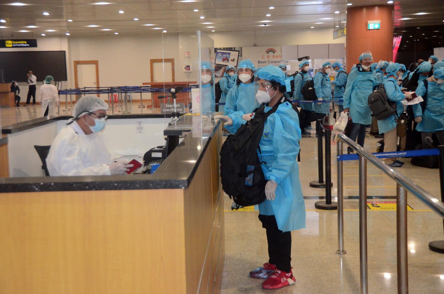 ၎င်းတို့ ရန်ကုန်အပြည်ပြည်ဆိုင်ရာလေဆိပ်သို့ ရောက်ရှိချိန်တွင် လူဝင်မှုကြီးကြပ်ရေး၊ ကျန်းမာရေးစိစစ်ရေး၊ သီးသန့်စီစဉ်ပေးသည့်နေရာ / သတ်မှတ် ဟိုတယ်များ၌ အသွားအလာ ကန့်သတ်မှု (၁၄)ရက်နှင့် နေအိမ်တွင် အသွားအလာ ကန့်သတ်မှု (၇) ရက် နေထိုင်စေရေး တို့ကို အလုပ်သမား၊ လူဝင်မှုကြီးကြပ်ရေးနှင့် ပြည်သူ့အင်အားဝန်ကြီးဌာန၊ ကျန်းမာရေးနှင့် အားကစားဝန်ကြီးဌာနနှင့် ရန်ကုန်တိုင်းဒေသကြီး အစိုးရအဖွဲ့တို့မှ သက်ဆိုင်ရာ အခန်းကဏ္ဍ အလိုက် တာဝန်ယူ ဆောင်ရွက်ပေးသည်။