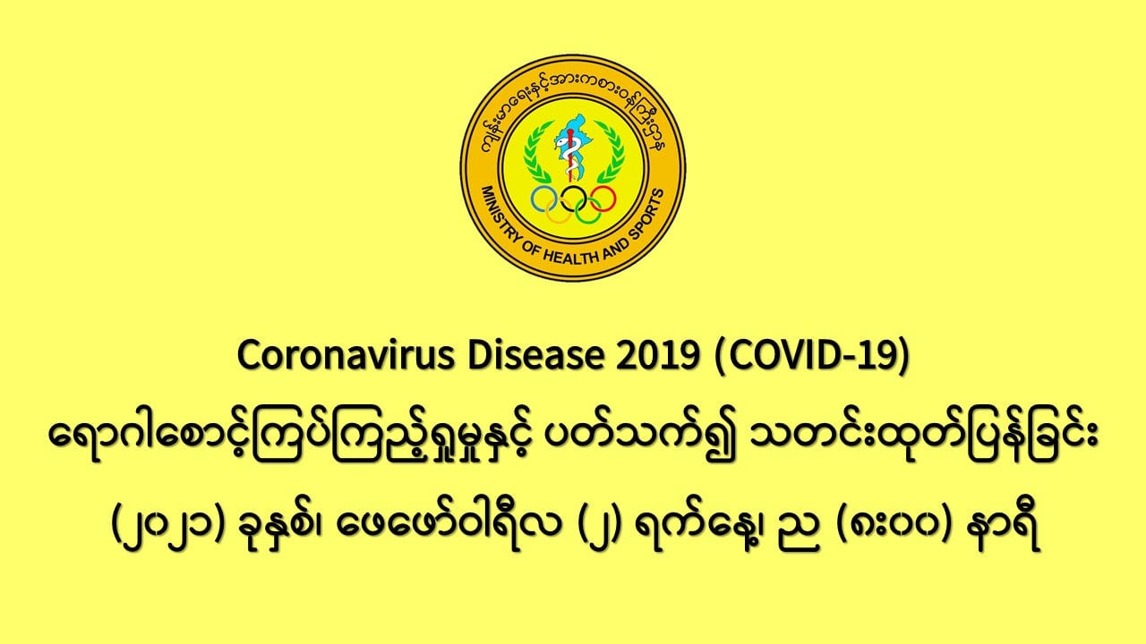 (၁-၂-၂၀၂၁)ရက်နေ့၊ ည (၈:၀၀)နာရီမှ (၂-၂-၂၀၂၁)ရက်နေ့၊ ည (၈:၀၀)နာရီအတွင်း ဓာတ်ခွဲ နမူနာ စုစုပေါင်း (၁၂,၃၇၇)ခု အား စစ်ဆေးပြီးစီးခဲ့ရာ COVID-19 ရောဂါ ဓာတ်ခွဲအတည်ပြုလူနာသစ် (၃၁၀) ဦး တွေ့ရှိရပါသည်။