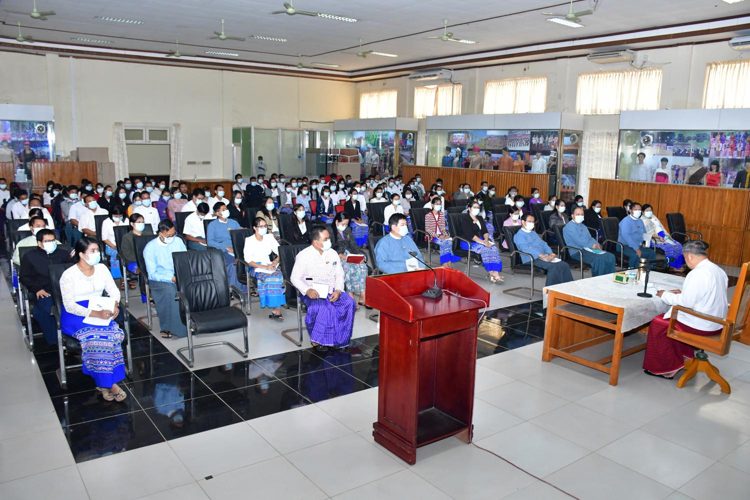 တွေ့ဆုံစဉ် ပြည်ထောင်စုဝန်ကြီးက မိမိသည် နိုင်ငံတော်စီမံအုပ်ချုပ်ရေးကောင်စီ၏ ခန့်အပ် တာဝန်ပေးချက်အရ ယခုကဲ့သို့ တိုင်းရင်းသား လူမျိုးများရေးရာ ဝန်ကြီးဌာနတွင် တာဝန်ထမ်းဆောင်ခြင်း ဖြစ်ပါကြောင်း၊ ယခင်အချိန်များကလည်း တိုင်းပြည်၏ တာဝန်များကို ထမ်းဆောင်ခဲ့ဖူးသူဖြစ်ပြီး အထူးသဖြင့် တိုင်းရင်းသားရေးရာ ကိစ္စရပ်များကို ဆောင်ရွက်ခဲ့ရကြောင်း၊ ငြိမ်းချမ်းရေး ဖော်ဆောင်မှုအတွက် ပြည်ထောင်စု ငြိမ်းချမ်းရေး ဆွေးနွေးမှု ပူးတွဲကော်မတီ (UPDJC) တွင်လည်း အဖွဲ့ဝင်အဖြစ် ပါဝင်ဆောင်ရွက်ခဲ့ကြောင်း၊ တိုင်းရင်းသား ဖွံ့ဖြိုးတိုးတက်ရေးအတွက် ကြိုးပမ်းလိုက်ပါ ဆောင်ရွက်သွားမည် ဖြစ်ပါကြောင်း၊ မိမိအနေဖြင့် အထူးပြောကြားလိုသည်မှာ နိုင်ငံ့ဝန်ထမ်းများဖြစ်သည့် အလျောက် နိုင်ငံ့ဝန်ထမ်းနည်းဥပဒေတွင် ပါရှိသည့်အတိုင်း ဥပဒေဘောင်အတွင်း နေထိုင်ရန်၊ ဝန်ထမ်း စည်းမျဉ်းစည်းကမ်းနှင့် အမိန့်ညွှန်ကြားချက်များ လိုက်နာရန်နှင့် ပါတီနိုင်ငံရေး ကင်းရှင်းရန် မှာကြားလိုကြောင်း၊ ဝန်ထမ်းများ စည်းလုံးညီညွတ်မှ လုပ်ငန်းခွင်အတွင်း ပျော်ရွှင်စွာ ဆောင်ရွက်နိုင်မည် ဖြစ်ကြောင်းနှင့် မိသားစုသဖွယ် ပူးပေါင်းဆောင်ရွက်ရန် လိုအပ်ပါကြောင်း၊ အချုပ်အားဖြင့်ဆိုပါက ဝန်ထမ်းများအနေဖြင့် မိမိ၏ Identity ကို ယုံကြည်ရန်၊ မိမိအနေဖြင့်လည်း တိုင်းရင်းသားများအတွက် ဆောင်ရွက်သွားမည်ဟု ကတိပြုပါကြောင်းနှင့် ဝန်ထမ်းများအနေဖြင့် မိမိတို့၏လိုအပ်ချက်နှင့် အခက်အခဲ များကို ပွင့်လင်းစွာ တင်ပြဆွေးနွေးနိုင်ပါကြောင်း ပြောကြားသည်။