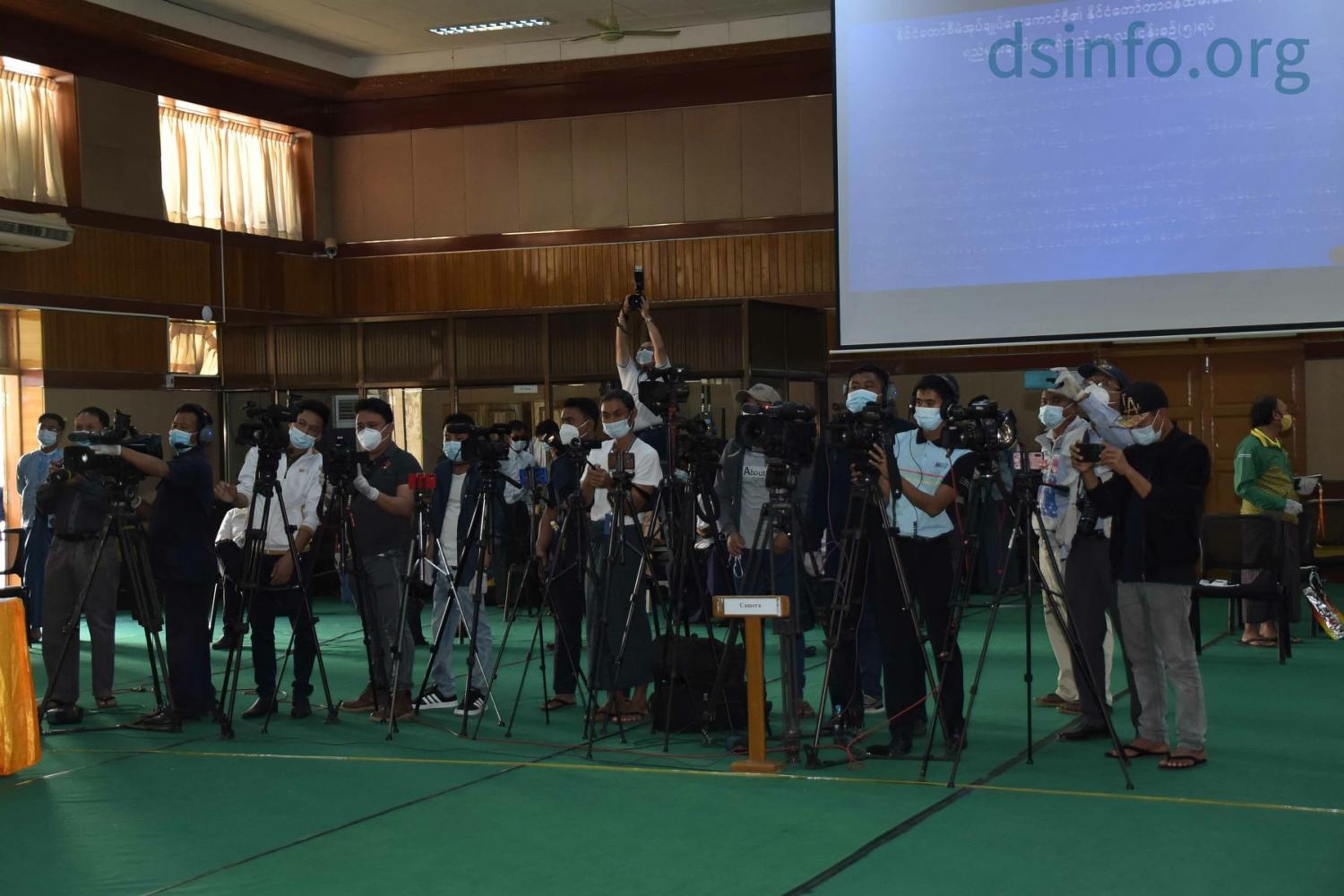 သတင်းစာရှင်းလင်းပွဲမစတင်မီ တက်ရောက်လာကြသူများအား COVID-19 ရောဂါ ကြိုတင်ကာကွယ်ရေးအတွက် တာဝန်ရှိသူများက လိုအပ်သည့် ကျန်းမာ ရေးဆိုင်ရာများဆောင်ရွက်ပေးပြီး သတ်မှတ်အကွာအဝေးအတိုင်း နေရာချထား ပေးသည်။